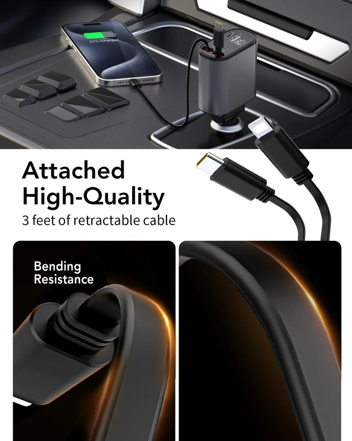 - Built-in 2 Retractable Cables, Refuse to Tangle: Cigarette Lighter USB C Charger Flexible retractable cable design, the cable can be up to 80cm long, with 7 length positions, more convenient to control and use when charging. The retractable cable will not tangle the cable and is easy to store, making your car space more tidy.