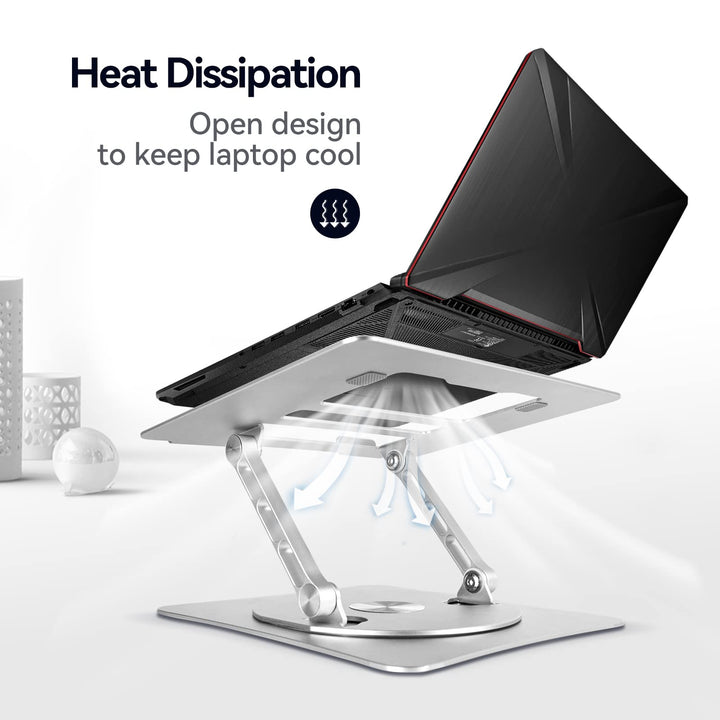 Solid laptop stand made of high-quality aluminium construction,Silicone anti-slip, firmly stick to the device and the desktop,built-in large rubber pads to protect your laptop from scratching.