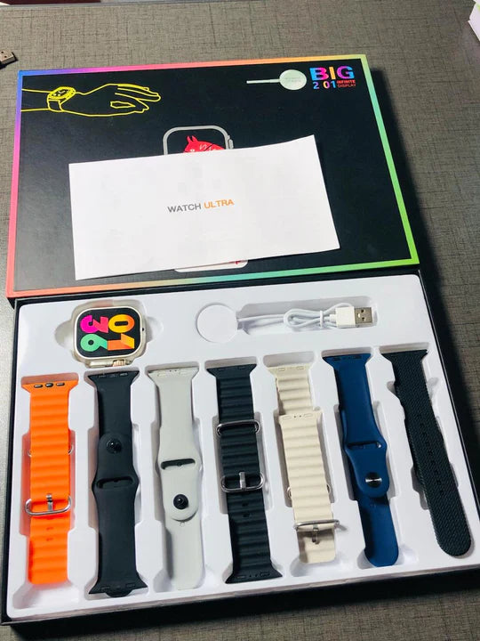 Product Details of 7in1 Ultra Smart Watch With Straps Metal Ocean Rubber Nylon Wireless Charger Bt Call In Ultra SmartwatchIntroducing the 7in1 Ultra Smart Watch, a game-changer in wearable technology. Packed with an array of cutting-edge features, this watch is designed to enhance your lifestyle like never before.With its sleek and stylish design, this watch comes with interchangeable straps made from high-quality materials such as metal, ocean rubber, and nylon. Choose a strap that matches your mood or outfit effortlessly.No more tangled wires or hassle of carrying around charging cables. The wireless charger included with the smartwatch ensures convenient and fast charging on the go. Stay connected without interruption.Experience the convenience of hands-free calling directly from your wrist. With Bluetooth call functionality, you can make and receive calls seamlessly without reaching for your phone.This ultra smartwatch is a perfect companion for those who value style, functionality, and versatility. Get ready to elevate your wearable experience with the 7in1 Ultra Smart Watch.